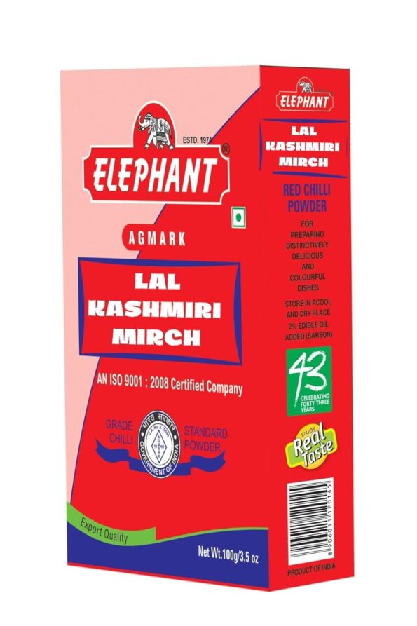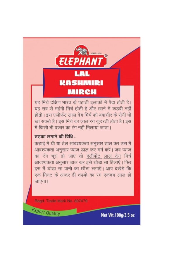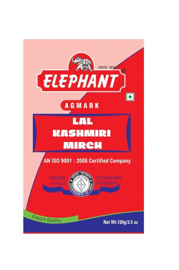 ELEPHANT Lal Kashmiri Mirch Powder is made from premium Kashmiri/Byedgi style chillies known for their brilliant red hue and moderate spice level. This variety is preferred for dishes where vibrant color and gentle warmth are desired.